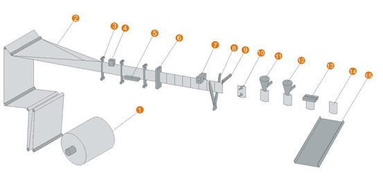 | 3包裝膜導向 | 6. 豎封機構 | 9.牽袋機構 | 12. 充填Ⅱ | 15. 成品輸出 |