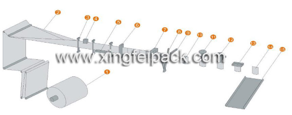 | 1.放膜裝置 | 5. 底封機構 | 9. 雙剪切機構 | 13. 雙開(kāi)袋機構 | 17. 成品 |