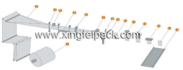 | 1.放膜裝置 | 5. 底封機構 | 9. 雙剪切機構 | 13. 雙開(kāi)袋機構 | 17. 成品 |