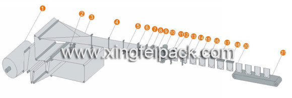 | 4.包裝膜導向 | 8.色標檢測 | 12.夾袋機構 | 16.充填2 | 20.成品輸出 |